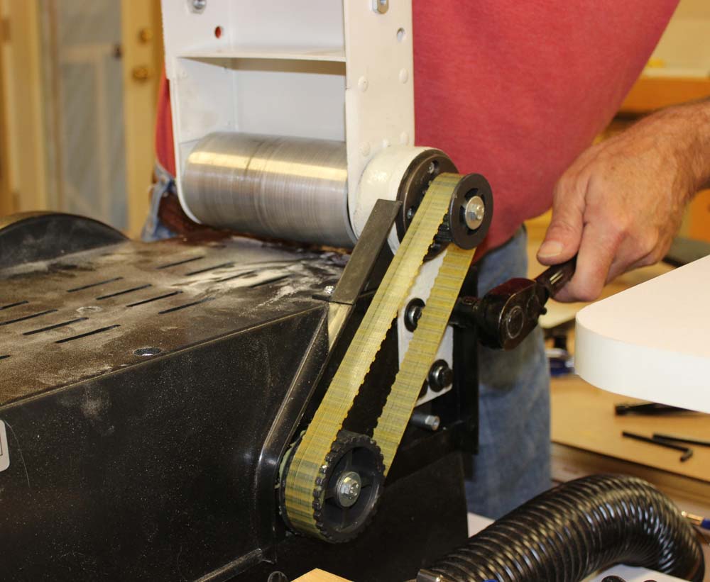 With the belt removed, I started looking for the source of the noise. The idler drum wheel for the sanding belt is adjustable for tracking purposes, and the inside of that drum was rubbing on the adjusting mechanism. I was able to disassemble and realign those parts and eliminate the rubbing. This was not a machine design flaw, or even a flaw in any of the parts --- this was simply sloppy assembly. It was beginning to look a little like my machine might have been built on Friday.